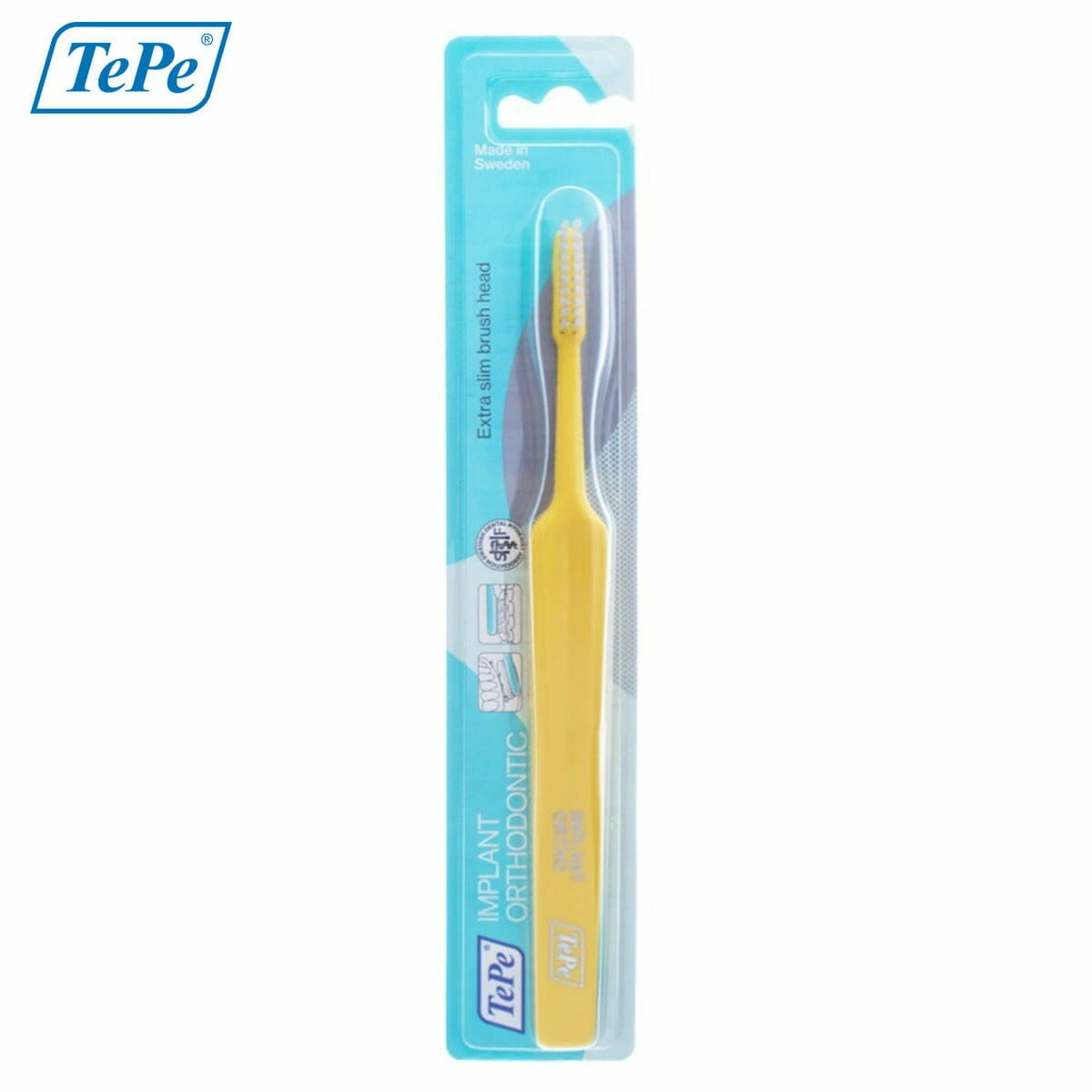 Szczoteczka TePe Implant/Ortho to doskonały wybór do pielęgnacji aparatów ortodontycznych i implantów. Charakteryzuje się wąską główką, długą i cienką szyjką oraz dwoma rzędami delikatnych włókien, które umożliwiają dokładne i delikatne czyszczenie. Produkt dostępny jest w czterech kolorach.